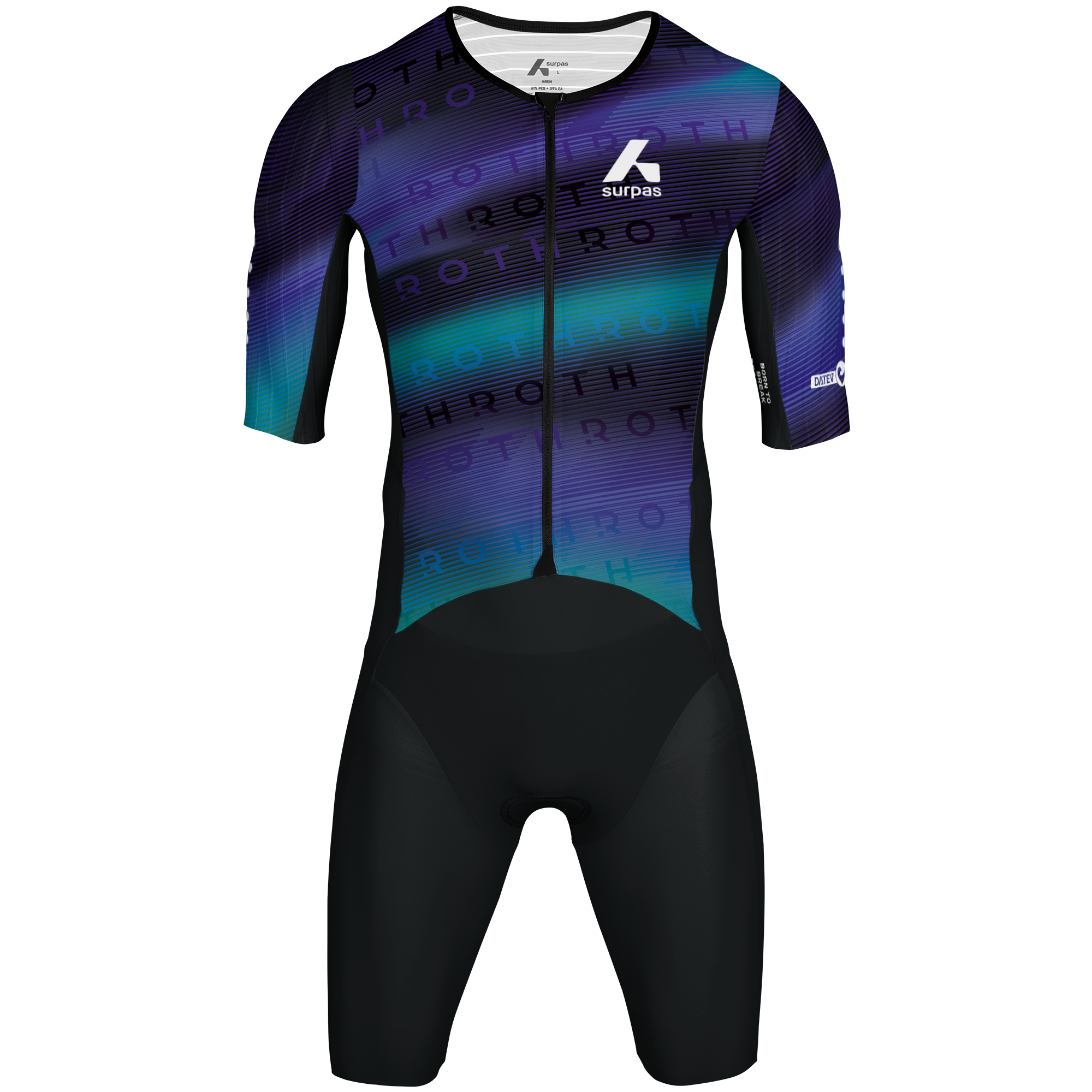 Long Distance Speedsuit with long-distance padding. The suit has aerodynamic turbulators on the shoulders and a back pocket for nutrition.