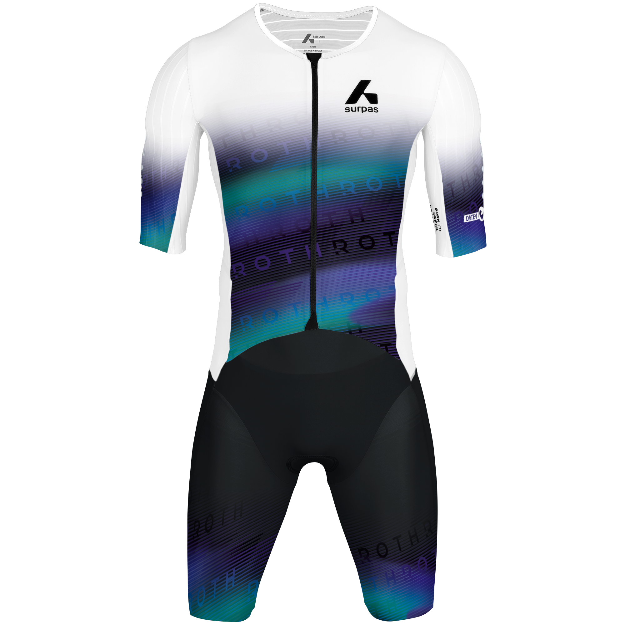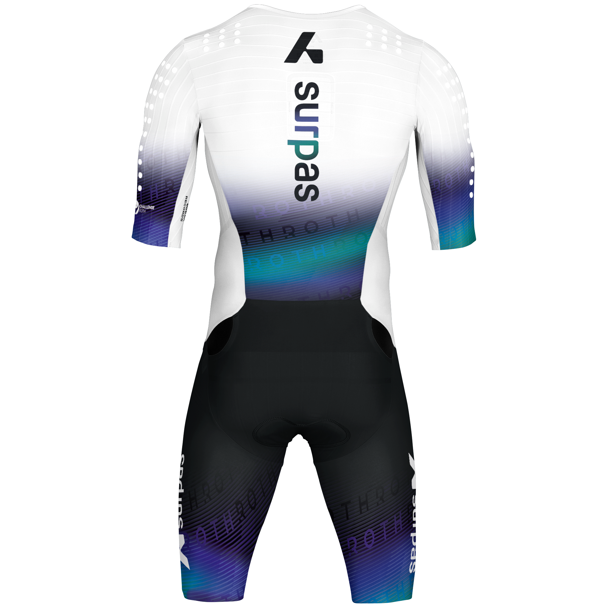 Long Distance Speedsuit with long-distance padding. The suit has aerodynamic turbulators on the shoulders and a back pocket for nutrition.
