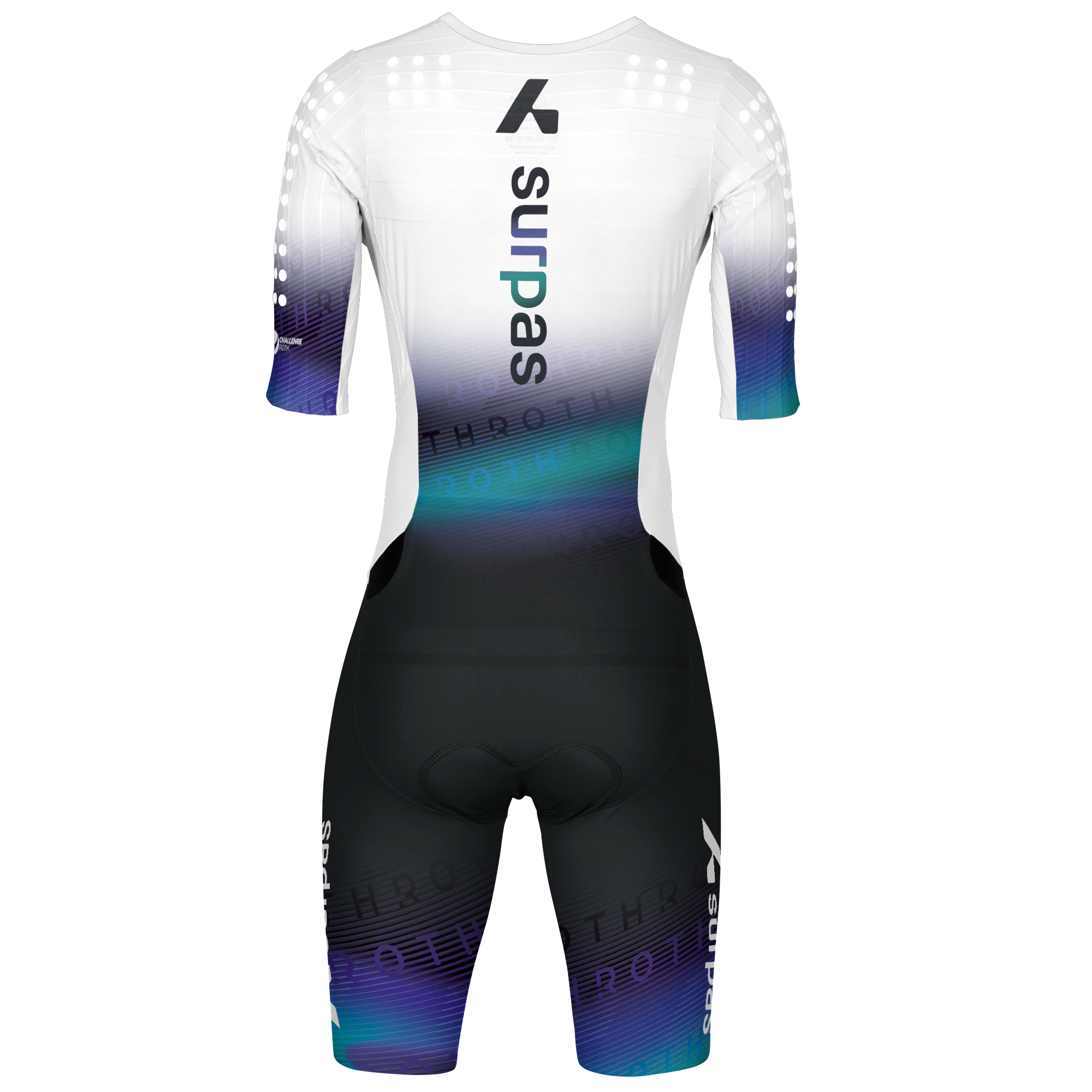 Long Distance Speedsuit with long-distance padding. The suit has aerodynamic turbulators on the shoulders and a back pocket for nutrition.
