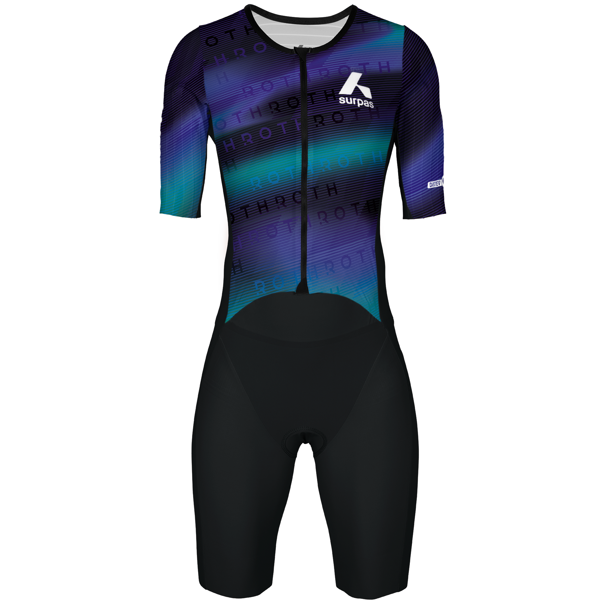 Long Distance Speedsuit with long-distance padding. The suit has aerodynamic turbulators on the shoulders and a back pocket for nutrition.