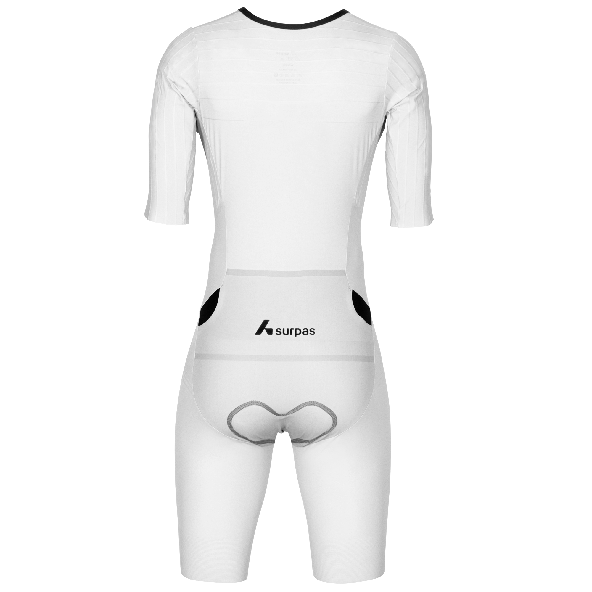 The suit has a concaved arm sleeve design with laser cut sleeves that sit close to the skin. Both the arm sleeve and leg sleeve lengths are optimised to truly maximise the aerodynamic effect of the material. Strategically placed turbulators and an aerodynamic striped material on the side panels add to the suits aerodynamic profile. A slightly deeper set neck opening and panels on the chest and upper-arm ensure optimal comfort in the upper-torso yet remain unrestrictive.