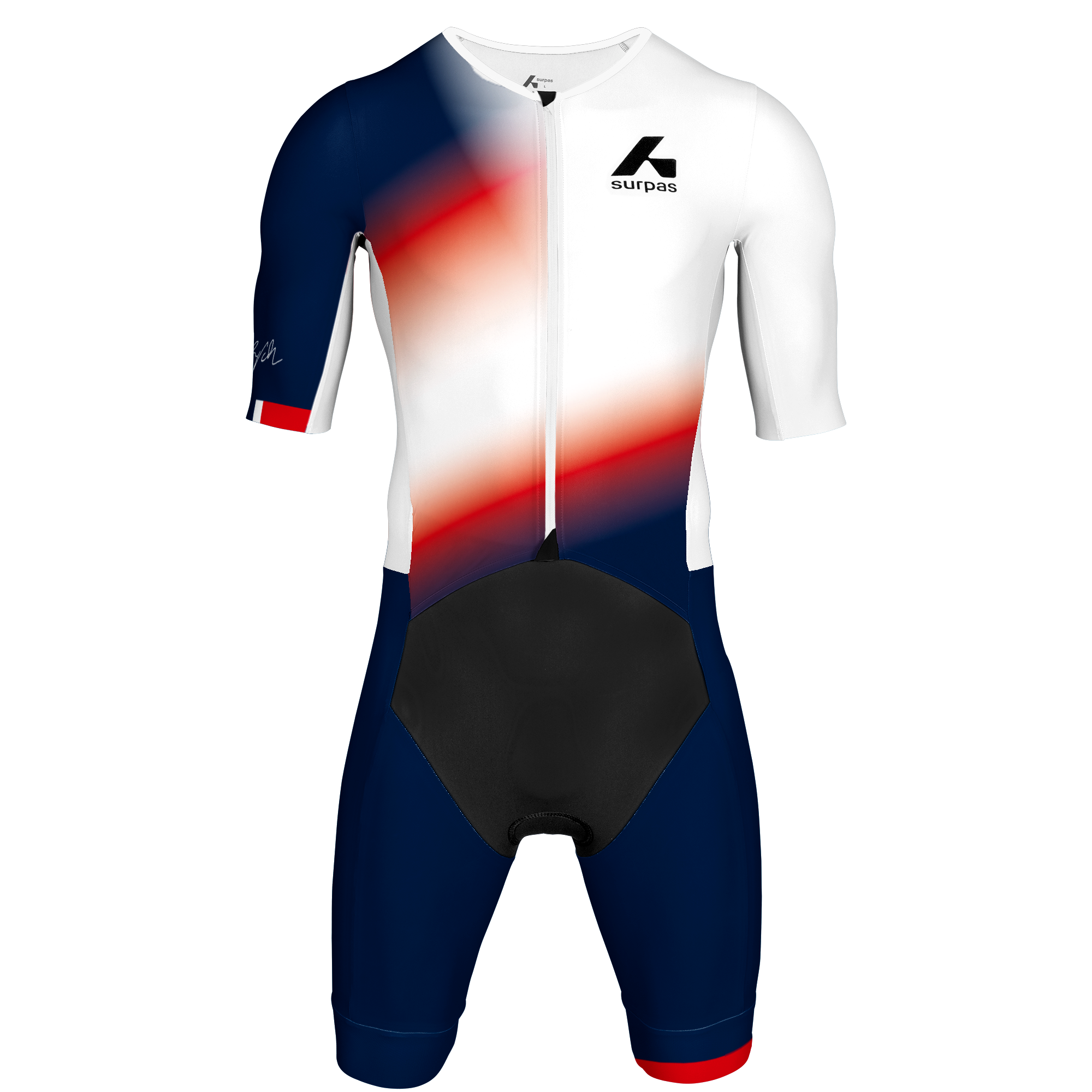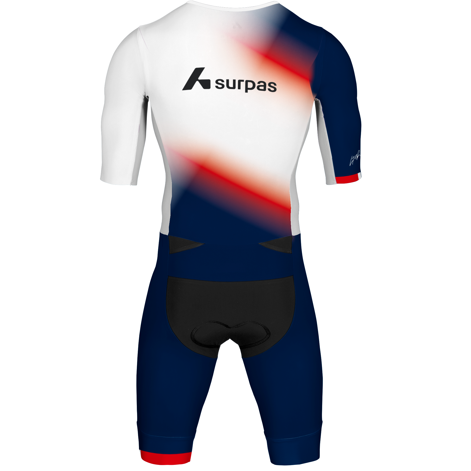 Long Distance Speedsuit with long-distance padding. The suit has aerodynamic turbulators on the shoulders and a back pocket for nutrition.