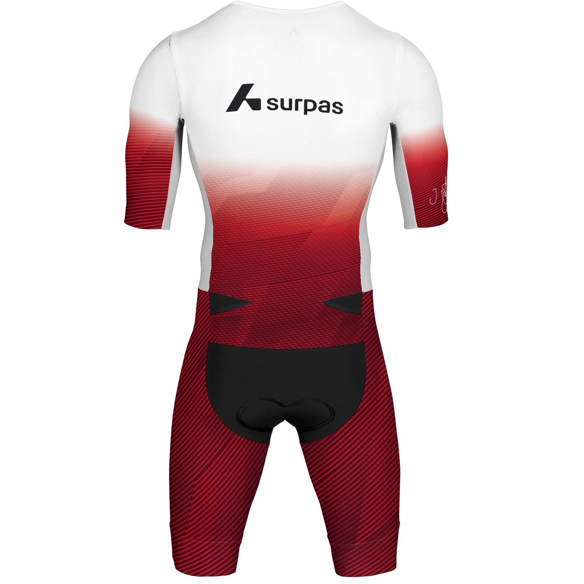 Long Distance Speedsuit with long-distance padding. The suit has aerodynamic turbulators on the shoulders and a back pocket for nutrition.