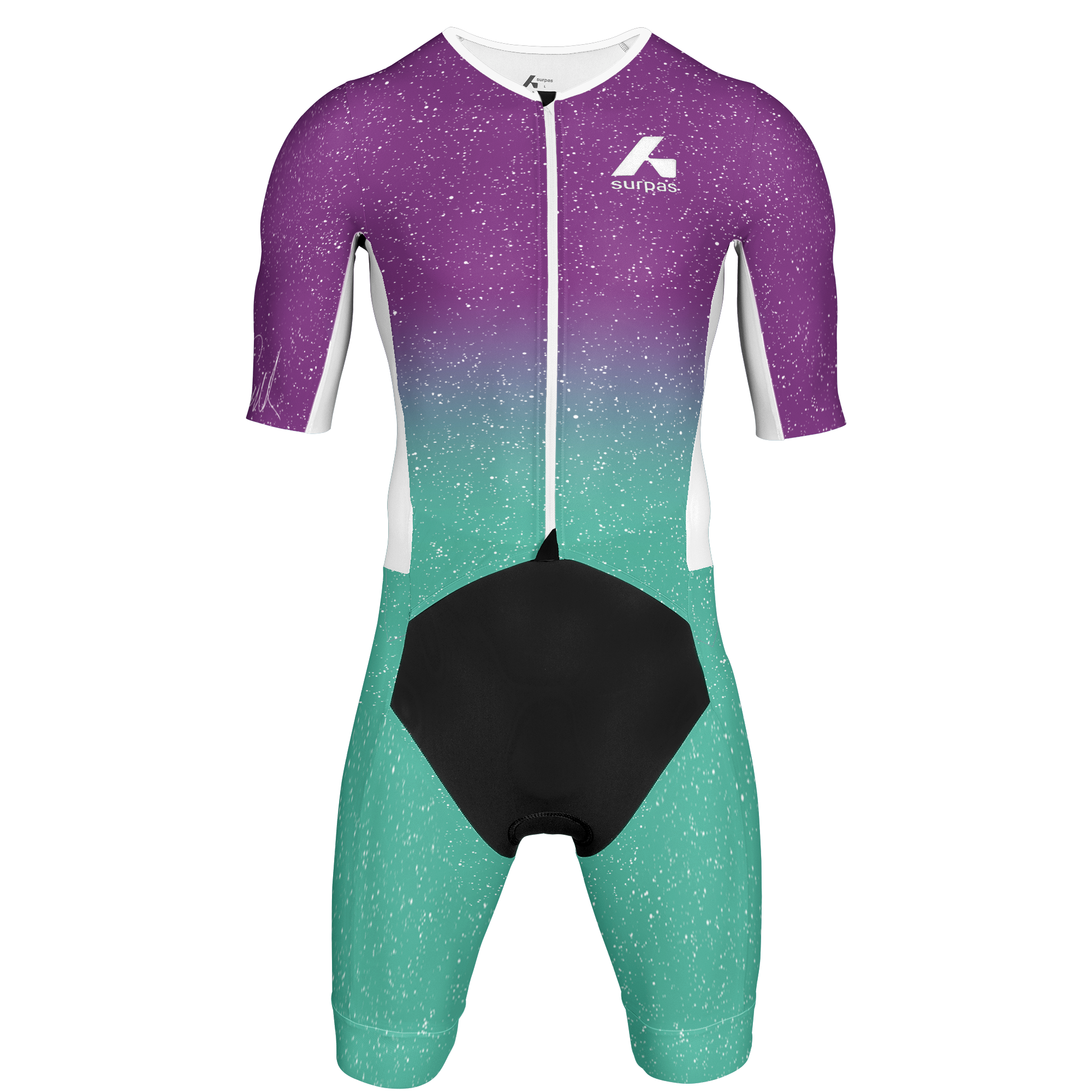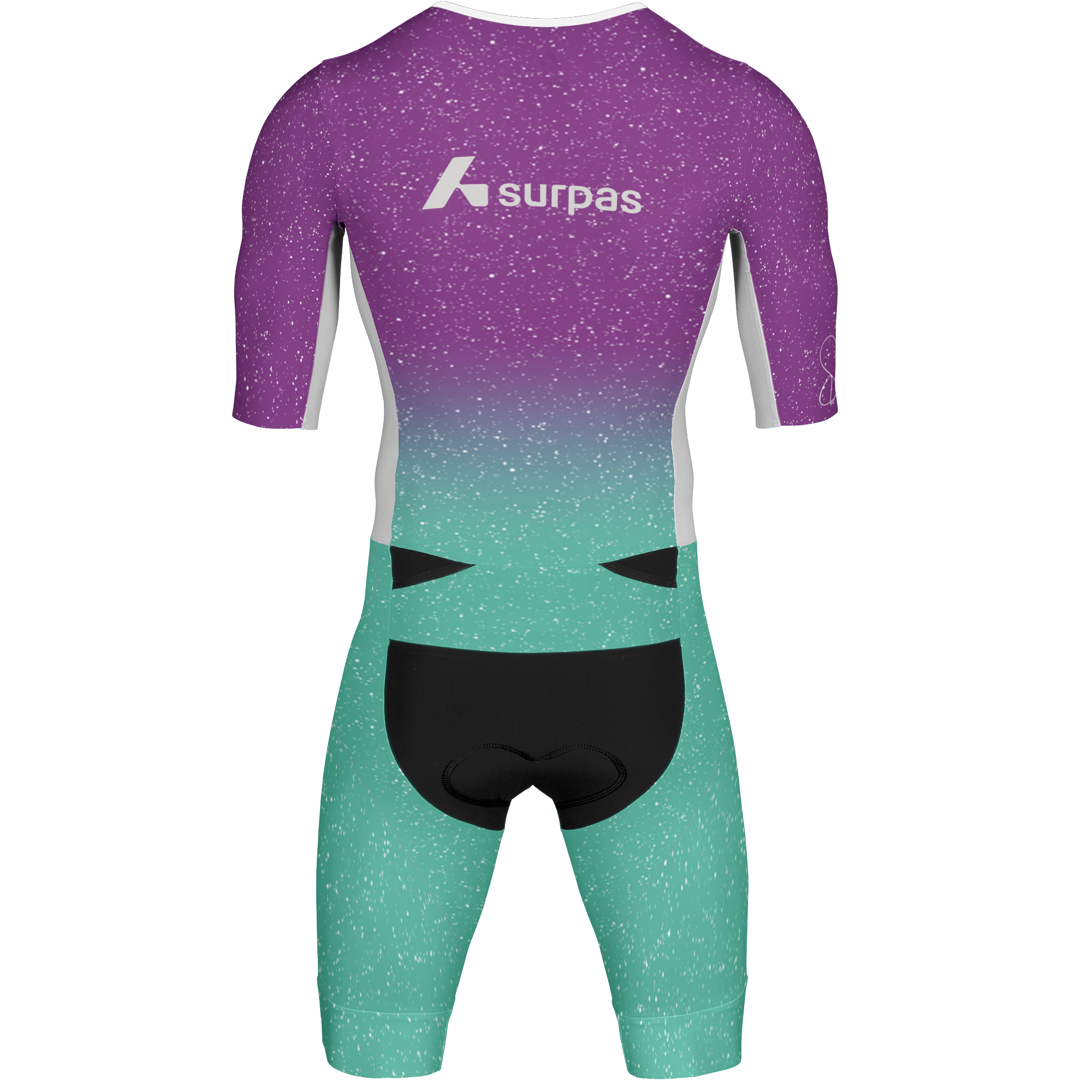 Long Distance Speedsuit with long-distance padding. The suit has aerodynamic turbulators on the shoulders and a back pocket for nutrition.