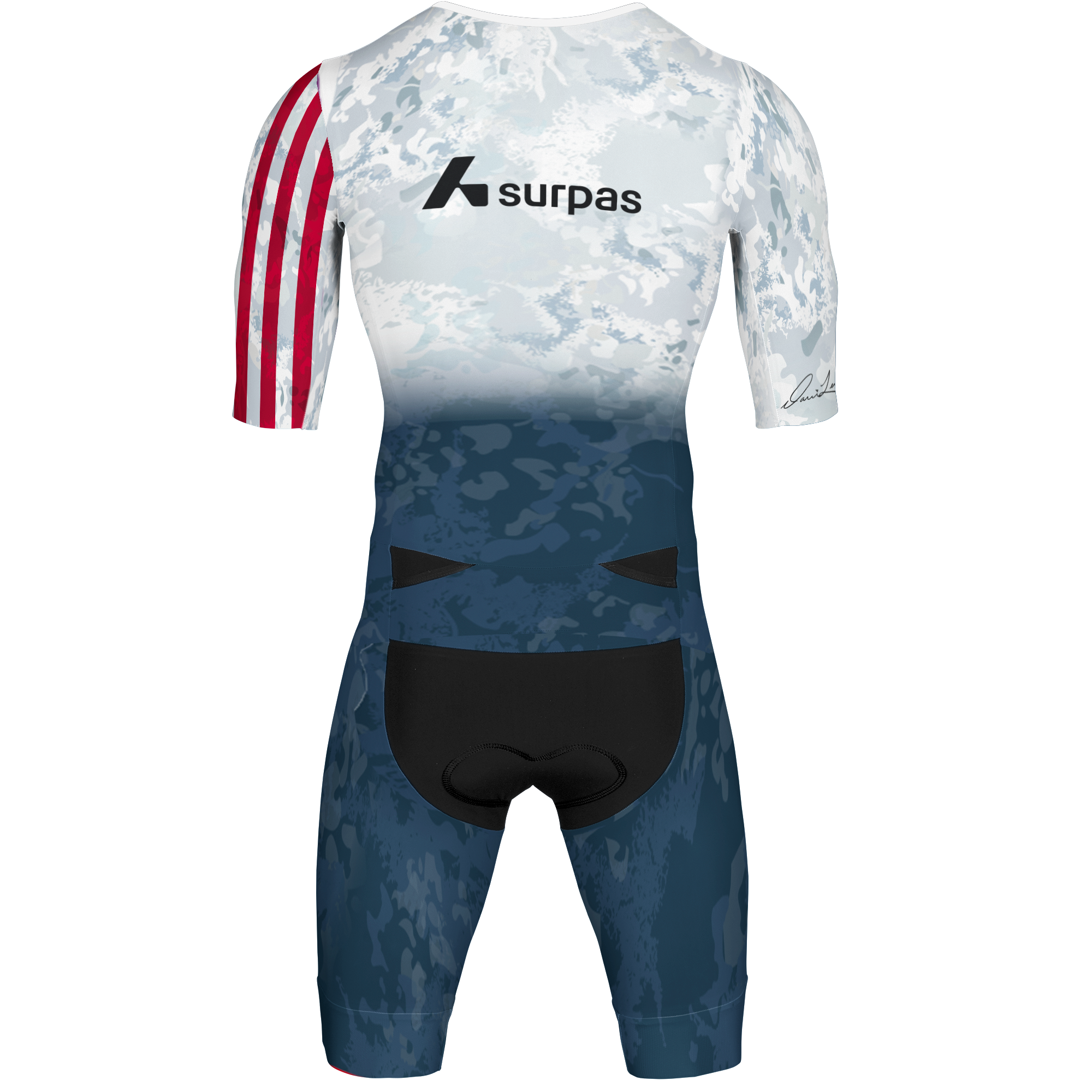 Long Distance Speedsuit with long-distance padding. The suit has aerodynamic turbulators on the shoulders and a back pocket for nutrition.