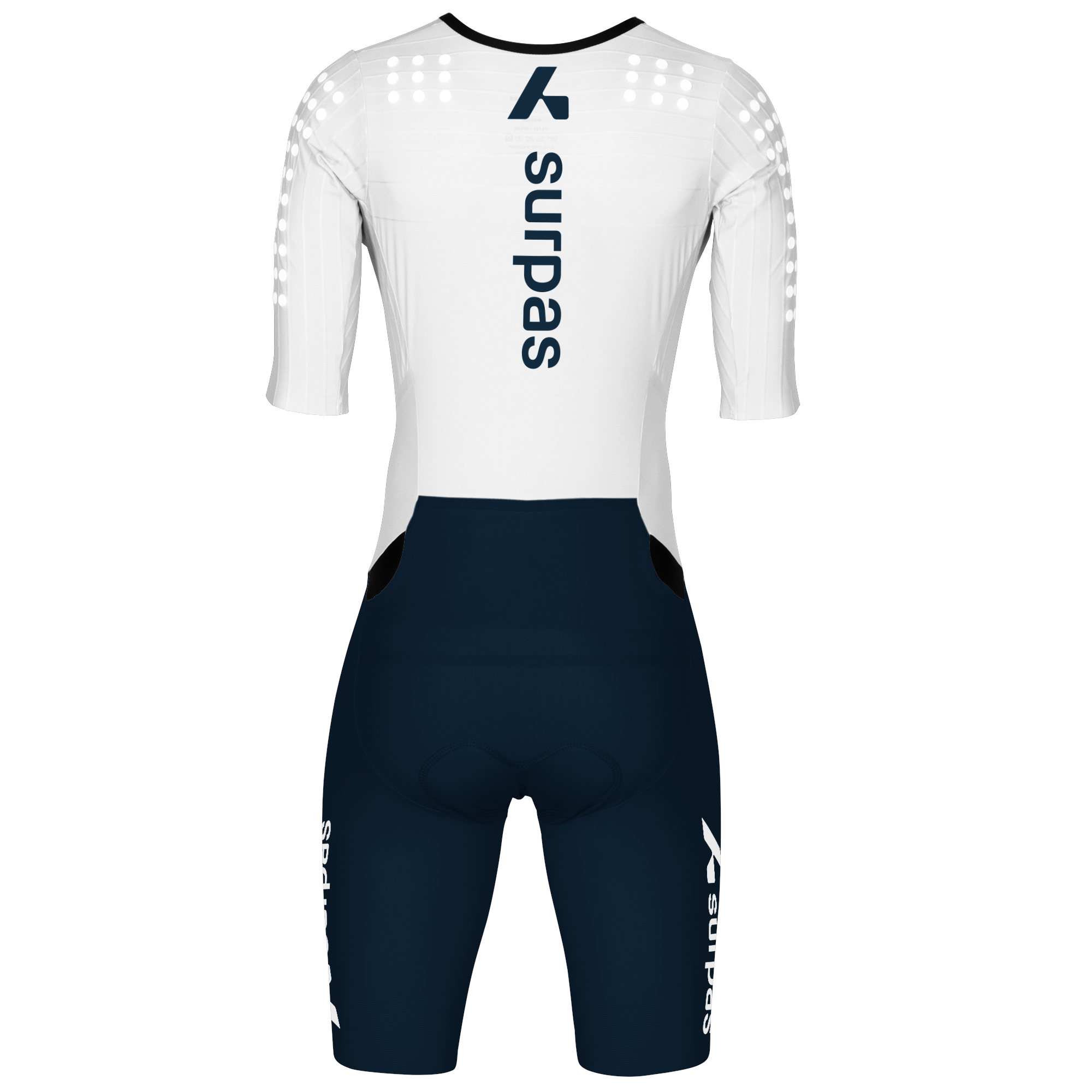 Long Distance Speedsuit with long-distance padding. The suit has aerodynamic turbulators on the shoulders and a back pocket for nutrition.